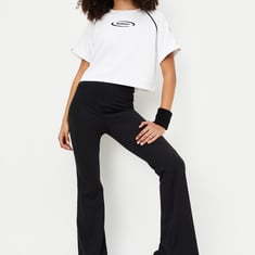 These solid flared high-rise track pants offer comfort and style with side pockets and an elasticated waist. Perfect for casual wear or a relaxed day out.