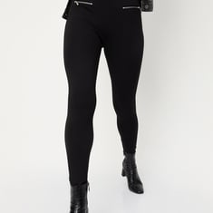 Make a classy outfit by wearing this pair of jeggings. It comes with a solid surface, front zipper detail, an elasticated waistline, and a full-length construction. It can be paired with a top and boots to make a complete look.