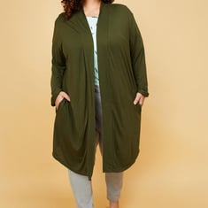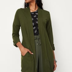 A layering staple, this knit shrug is rendered in a solid tone. It is designed with an open front, three-quarter sleeves, a tab at the back, waist pockets, and a waterfall hem. Team up this shrug with a tee and trousers to complete the look.
