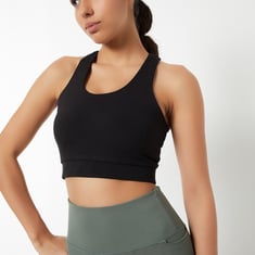 Train in comfort with this solid racerback sports bra, featuring a scoop neck, elasticated hem, and quick-dry fabric for lasting freshness. Designed for ease of movement and everyday performance.