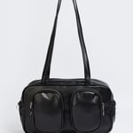 This solid shoulder bag features a zip closure for secure storage and outer zip compartments for added convenience. With twin handles, it offers both style and practicality, making it perfect for everyday use or on-the-go.