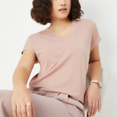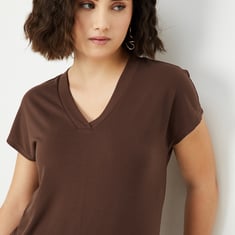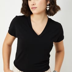 Keep it simple and stylish with this solid V-neck t-shirt. Featuring half sleeves and a classic fit, this wardrobe essential offers both comfort and versatility. Model Size :