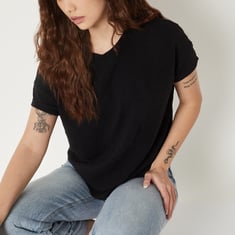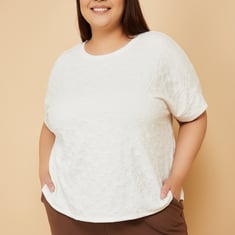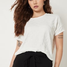 This solid textured top features a clean round neck, half sleeves, and drop shoulders for an effortlessly modern silhouette. The subtle texture adds depth, making it a chic staple for both work and weekend dressing. Model Size :