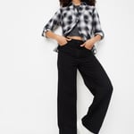 These solid wide-leg jeans offer a flattering fit with classic button closure, belt loops, and five pockets for added convenience. Model Size :