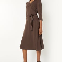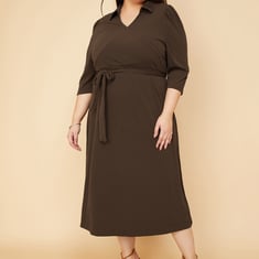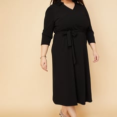 This solid, textured, wrap midi dress features a collared neckline, 3/4th sleeves, and a tie-up detail at the waist that flatters the figure with effortless sophistication.Model Size