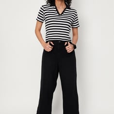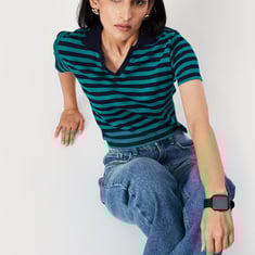 Women Striped Collared Half Sleeves Cropped T-shirt