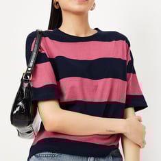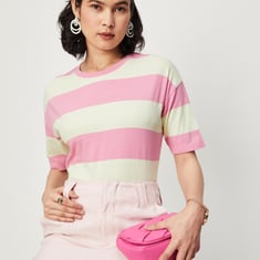A basic addition to your casual rotation, this T-shirt is updated with a striped pattern. it is designed with a ribbed round neckline, drop shoulders and short sleeves. A pair of treggings and wedge sandals with this T-shirt elevate your style.