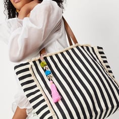 Carry everything in style the eco-friendly way in this tote bag. It has a striped exterior with fringe trim, flat handles, and pompom and tassel charm. The main spacious compartment has a zip top to store all your essentials.