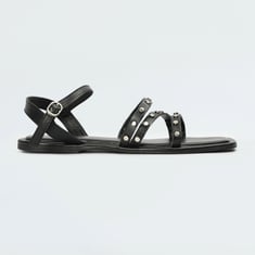 Elevate your style with these flat sandals, featuring metallic studs on the straps and an ankle-wrap strap with a buckle closure for a chic touch. With a sleek flat sole and modern squared toe, they offer both comfort and contemporary flair.