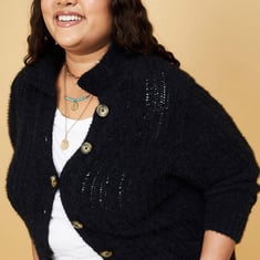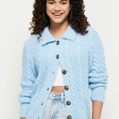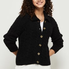 Breeze through the winter in style in this cardigan. It is designed with knit patterns, a collared neck, button closure, and full sleeves. To complete your winter-ready evening look, style it over a top or tunic and pair it up with complementing trousers and pumps.