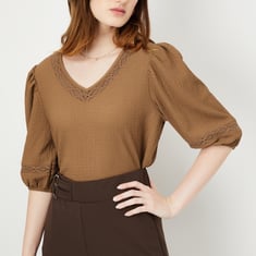 Elevate your casual wardrobe effortlessly with this fashionable knit top. Boasting a V-neck and stylish puffed sleeves, it adds a touch of chic sophistication to any outfit.