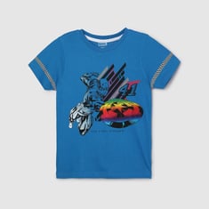 Highlighted with Captain America graphic print, your little one will flaunt his love for superheroes with this T-shirt. It has a crew neck, short sleeves with prints, and a straight hem.