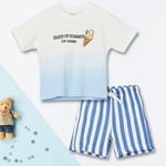 Stay cool and coordinated in this printed shorts set. Includes a printed crew neck T-shirt with half sleeves and striped shorts with a drawstring closure for a relaxed fit.