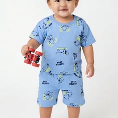 Stay cool and casual in this printed shorts set, featuring a comfy T-shirt with a crew neck, half sleeves, and button closure at the neck. Paired with drawstring shorts with pockets, it’s perfect for relaxed days.