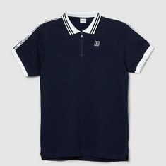 Make your young one's day a striped adventure in this casual polo T-shirt which features shoulder tape detail on a solid surface with a contrast polo collar with zipper closure and short sleeves. Grab these soft comfort wear letting the stripes and smiles begin.