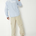This striped shirt features a crisp spread collar, classic button placket, and full sleeves with button cuffs for a tailored look. A bold back print adds a contemporary twist to this timeless silhouette.