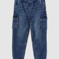 Get him ready for everyday adventure with this pair of denim joggers. The whisker detailing and washed finish adds a lived-in look. This pair has cargo pockets and a drawstring waist.