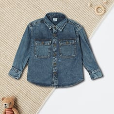 Spruce up your kids' casual style with this denim shirt. It features a spread collar, full sleeves, two flap pockets on the chest, and a curved hem, combining classic elements with a modern twist.