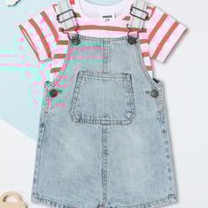 Add a playful twist to your wardrobe with this washed dungaree set, designed for both comfort and style. Featuring button closure straps and a convenient kangaroo pocket, it’s paired with a striped crew neck T-shirt with half sleeves for a laid-back, trendy vibe.
