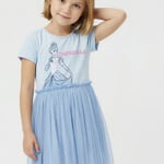 Add a magical touch to her wardrobe with this charming Cinderella print dress. Designed with a round neckline and half sleeves, it blends everyday comfort with fairytale style.