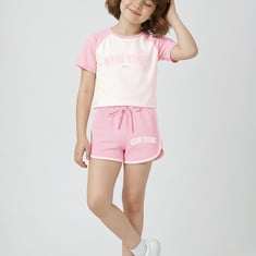 This colourblock shorts set features a trendy t-shirt with a round neck and half sleeves, paired with printed shorts that include taping details and a drawstring closure. A perfect blend of style and comfort for casual, laid-back days.