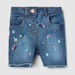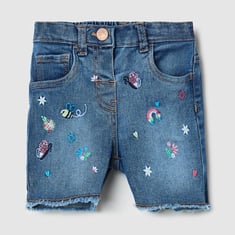 An ideal pick for a casual wardrobe, this pair of denim shorts are designed with embroidery, elasticated waistline, button closure, and insert pockets.