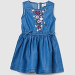 Blend into class and grandeur with this embroidered denim dress, which is tailored with a round neck, sleeveless construction, and a button closure.