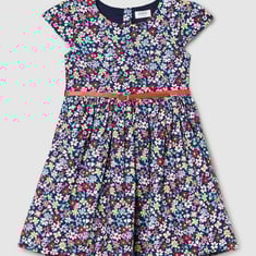 An ideal pick for your little one, this A-line dress is designed with a floral printed surface, round neckline, cap sleeves, and a sash tie-up belt at the back.