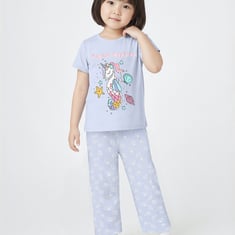 This Unicorn print PJ set features a playful printed t-shirt with a round neck and half sleeves, paired with comfortable pyjamas that have an elasticated waist for the perfect fit.