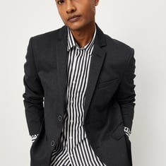 Look dapper by layering your outfit with this blazer. This classic design is styled with a striped pattern, lapel collar, long sleeves, a 2-button front, a chest welt pocket, and flap pockets. Complete the style by layering this blazer over a sweater and team up it up with trousers and formal lace-ups.
