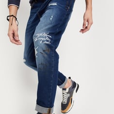 Make an edgy statement with this pair of jeans crafted in a carrot-fit profile. It is highlighted with distressed detailing, doodle prints, and washed effect. This pair of jeans features a belt loop waist and five pockets.