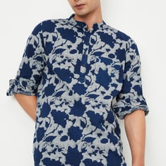 Elevate your ethnic style with this short kurta, designed to modernize your fusion wardrobe. It features a printed surface, a band collar, full sleeves with roll-up tabs, a patch pocket, a half-button placket, and a curved hem.