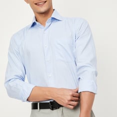 Upgrade your wardrobe with this striped shirt. Featuring a spread collar, full sleeves with buttoned cuffs, a curved hemline, a patch pocket, and a button-down front, its textured design effortlessly suits formal occasions.