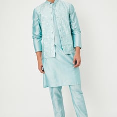 Elevate your ethnic style with this set, featuring an embroidered Nehru jacket, a solid kurta with a band collar, button placket, full sleeves, and waist pockets, paired with solid pyjamas featuring an elasticized waist for a complete and stylish ensemble.