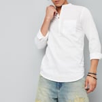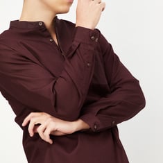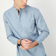 Enhance your fusion wear collection with this stylish kurta. It features a band collar, a half-button placket with a dobby woven design, and full sleeves with button cuffs.