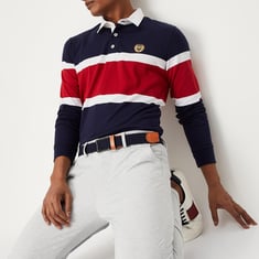Go from work to weekend in the comfort and style of this slim-fit T-shirt. It features a striped pattern, a polo collar, long sleeves, ribbed trim, and side slits at the hem. Smarten your outfit by teaming this T-shirt with a pair of trousers and casual lace-ups.