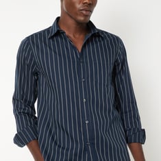 This shirt features a classic striped pattern with long sleeves, a spread collar, and a curved hem, tailored in a slim fit for a contemporary, polished look. Ideal for smart-casual occasions or office wear.