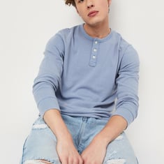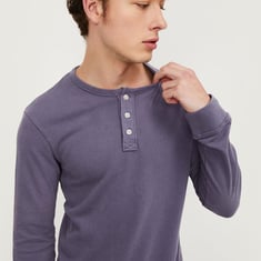 Induce comfort and style with this T-shirt accentuated by a textured pattern, full sleeves and a henley neck. For a trendy weekend outfit, team this T-shirt with jeans and sneakers.