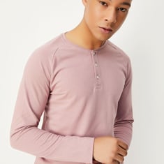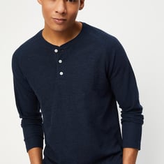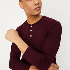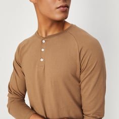 Induce comfort and style with this T-shirt accentuated by a textured pattern, full raglan sleeves and a henley neck. For a trendy weekend outfit, team this T-shirt with jeans and sneakers.