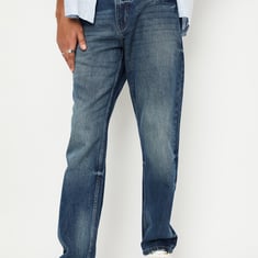 Get that effortlessly cool vibe with these washed straight-fit jeans. Featuring a classic 5-pocket design, mid-rise, and secure button closure, these jeans combine style and functionality. The washed finish give them an edgy, laid-back appeal.