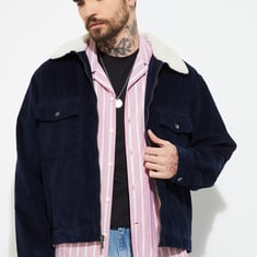 Wrap yourself in cozy style with this sherpa lined corduroy jacket, designed for warmth and flair. Featuring a sleek zip closure, full sleeves, and a sherpa spread collar, it blends comfort with timeless appeal. Functional flap pockets add a practical touch, making it perfect for everyday wear.