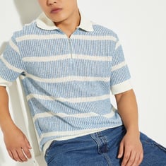 Step into effortless style with this striped oversized polo T‑shirt featuring a polo collar, zip closure, and half sleeves crafted in soft knit fabric. Relaxed yet refined, it’s perfect for casual wear with a modern twist.