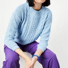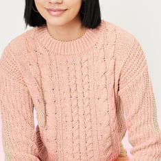 This elegant cable knit cropped sweater will keep you warm and fashionable throughout winter. It has a round neck, full sleeves, and a ribbed hem. Style this sweater with a pair of jeans and lace-up shoes for a cosy look.