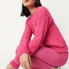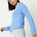 Combat the chilly weather with this medium-weight sweater. The fuzzy cable knit pattern keeps you warm and toasty, while the tie-up at the hem adds to the style. It features a crew neck, drop shoulders, long sleeves, and ribbed trim. Look winter chic by teaming up this sweater with jeans and sneakers.