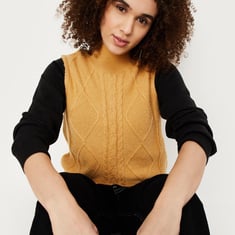 Make your winter outing a cosy session with this cable knit sweater. It flaunts a high neck and sleeveless profile. It looks best when teamed with a skirt and lace-up shoes.
