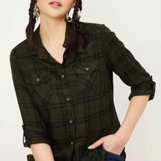Effortlessly stylish, this casual shirt features a spread collar, button placket, two flap pockets, and full sleeves with roll-up tabs. The checked pattern adds classic charm, elevating your casual ensemble.
