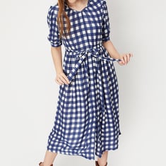 Bring out the best of fashion with this checked A-line dress. It flaunts a round neck, puffed sleeves, belt detail, and a midi silhouette. This dress can be teamed with a pair of boots to pull off a chic look.
