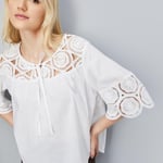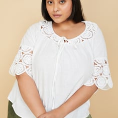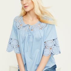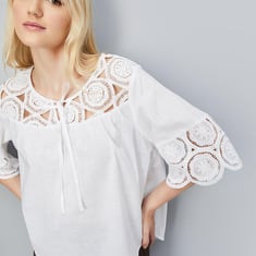 Enhance your wardrobe with this elegant top featuring crochet lace detailing on the yoke and cuffs. With a tie-up neck, flared sleeves, and a solid bodice, it exudes sophistication and style.