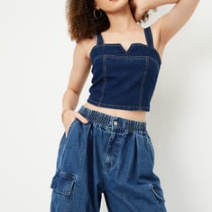 Turn heads in this denim corset top, featuring shoulder straps and a cropped fit that flatters your figure. The smocked back adds stretch and comfort, creating a perfect blend of style and ease.