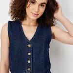 Flaunt an edgy look in this denim waistcoat crop top featuring a v-neck, with buttoned front while the sleeveless look makes it more versatile for styling.